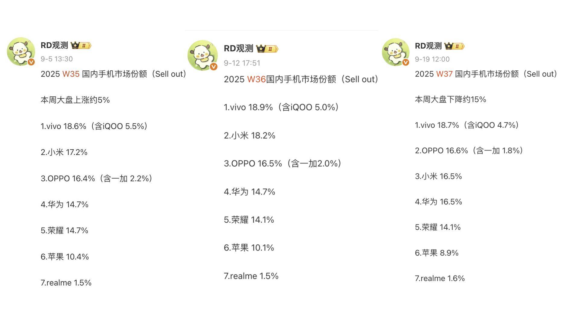排名第二的是小米,它的市场份额为16.4%,作为横向对比,2025年7月份份额为16.2%。比较有趣的是,8月份小米并未发布新机,所以导致份额增长的应该是此前开售的机型。从周畅销榜数据来看,销量主力应该是红米K80系列和红米Turbo4系列,还有定位小屏旗舰的小米15。目前小米17系列已经官宣,发布时间是2025年9月25日,所以小米Q4的成绩更值得期待。